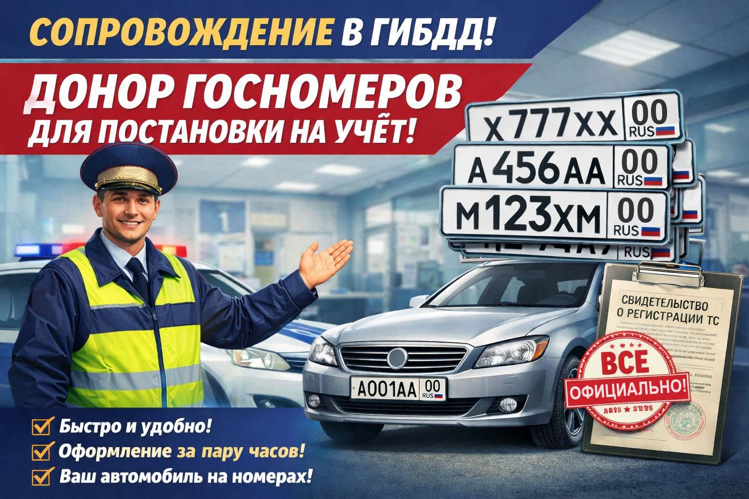 Мы предоставляем автомобиль, на который временно ставится нужный номер, и сопровождаем весь регистрационный цикл.
